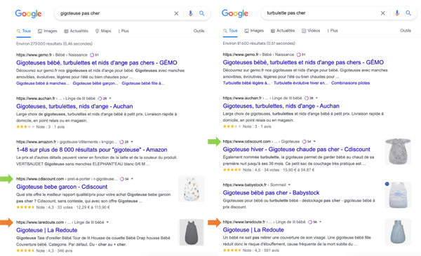 Il ne s’agirait plus de faire une page optimisée pour « turbulette pas cher » et une autre pour « gigoteuse pas cher ». Mais de comprendre que ces deux requêtes synonymes couvrent une même intention, et donc doivent correspondre à une même page. Et pourtant…