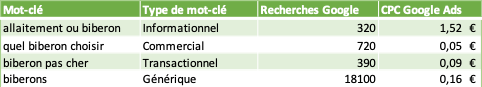 Le taux de conversion sera peut-être inférieur au trafic issu de requêtes explicitement transactionnelles (« biberon pas cher », « acheter biberon », etc.). Mais même avec un taux de conversion 10 ou 20 fois inférieur, si occuper la première position sur le mot-clé générique amène 40 fois plus de trafic, alors les résultats en termes de ventes et chiffre d’affaires générés resteront bien plus intéressants.